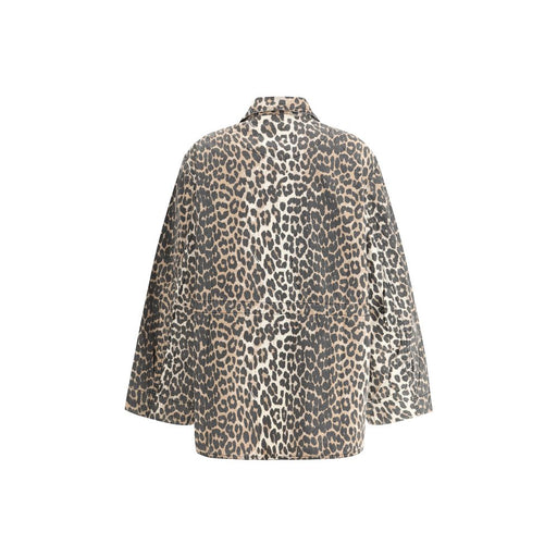 Original price $432.80Current price $377.62| /Cotton Jacket by Ganni, classic collar, front button closure, four front patch pockets with flap, all-over leopard pattern, oversize fit.
