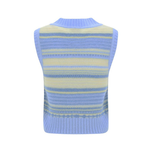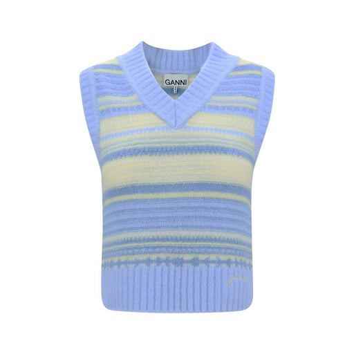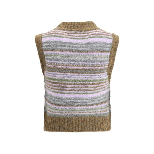 Original price $345.78Current price $258.14| /Merino Wool Vest by Ganni featuring ribbed V-neck, ribbed hem with contrasting iconic brand monogram detail, striped pattern, regular fit.