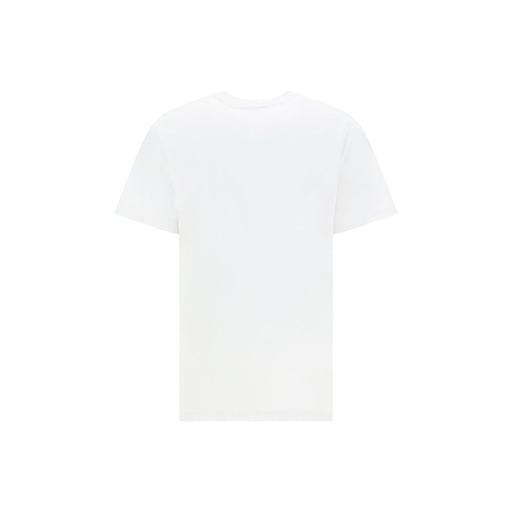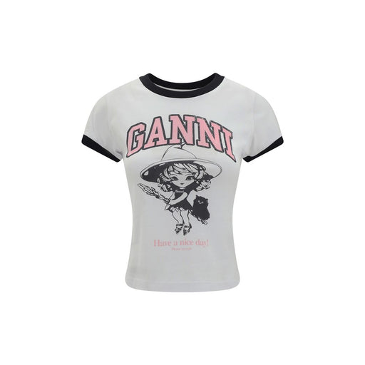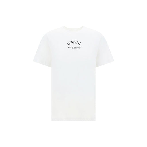 Original price $140.66Current price $129.84| /Cotton T-Shirt by Ganni, ribbed crew neck, monochrome pattern, iconic brand monogram printed in contrast on front, regular fit.