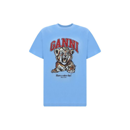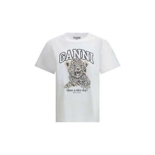 Original price $173.12Current price $157.97| /Cotton Tiger Relaxed T-Shirt by Ganni featuring ribbed crew neck, maxi print with iconic brand monogram contrasting on front, monochrome pattern, r...