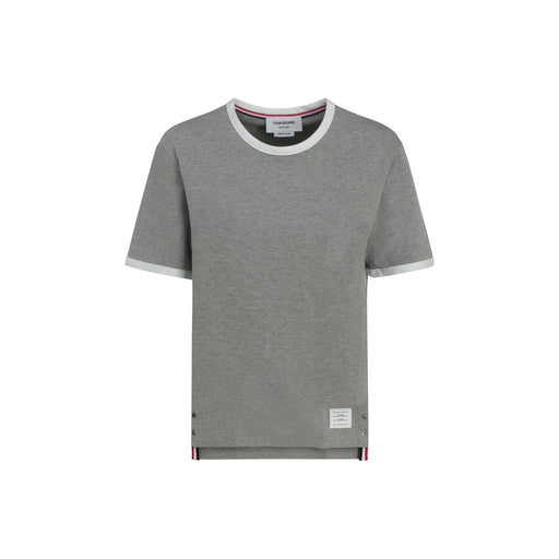 Original price $486.90Current price $418.73| /Cotton T-Shirt by Thom Browne, contrast ribbed crew neck, contrast sleeve hem, patch with iconic brand signature embroidered on the front, regular ...