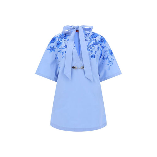 Original price $1,915.14Current price $1,097.15| /Cotton Top by Gucci, short-sleeved design, deep V-neck on front, applique band at neck to be knotted on front, floral print on front and back, icon...