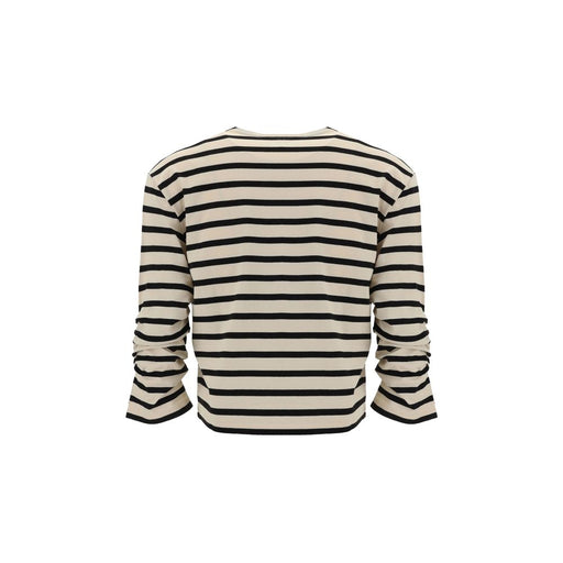 Original price $519.36Current price $418.73| /Cotton Top by Tory Burch, cropped style, short sleeves with ruffled detail, two-tone striped pattern, regular fit.