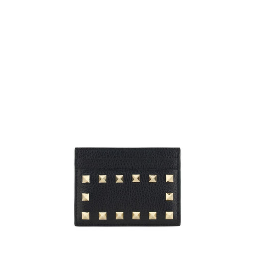 Original price $324.60Current price $285.65| /Calfskin Rockstud Card Holder by Valentino Garavani, grained leather design, card slots on front and back, iconic brand studs applied in contrast o...