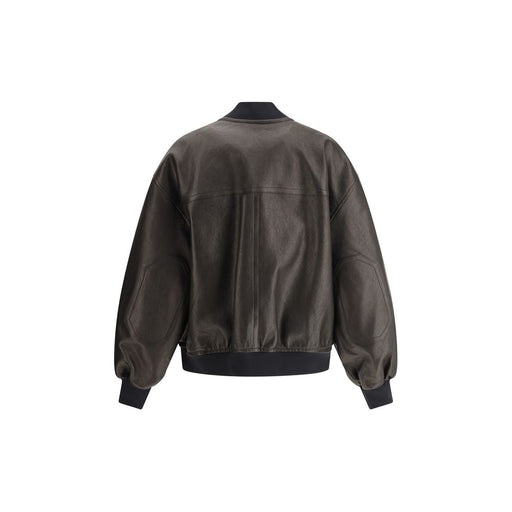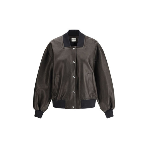 Original price $4,674.24Current price $3,197.31| /Spence Leather Jacket by Khaite, ribbed fabric collar, ribbed cuffs, elastic ribbed hem, front snap closure, two front welt pockets with flaps, wid...