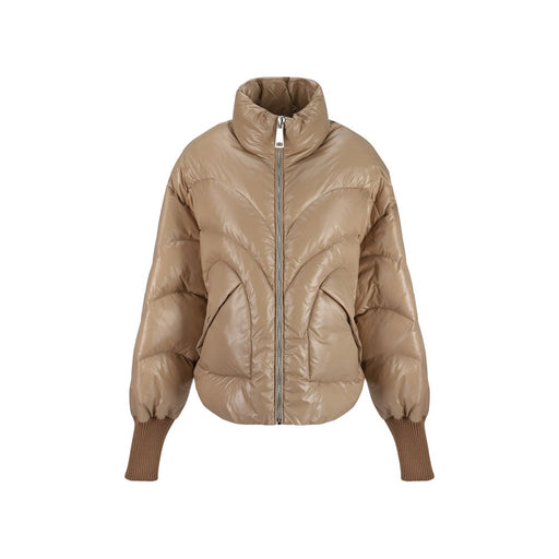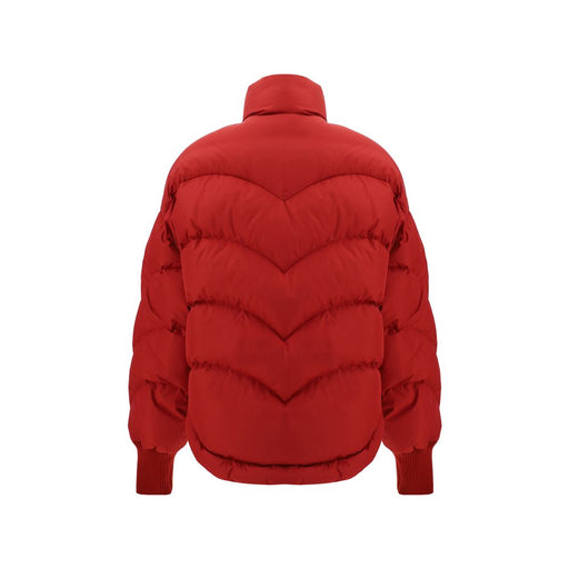 Original price $1,915.14Current price $1,028.98| /Corazon Shiny Down Jacket by Khrisjoy, high collar, front zipper closure, ribbed cuffs, two heart-shaped patch flap pockets on front, all-over quil...