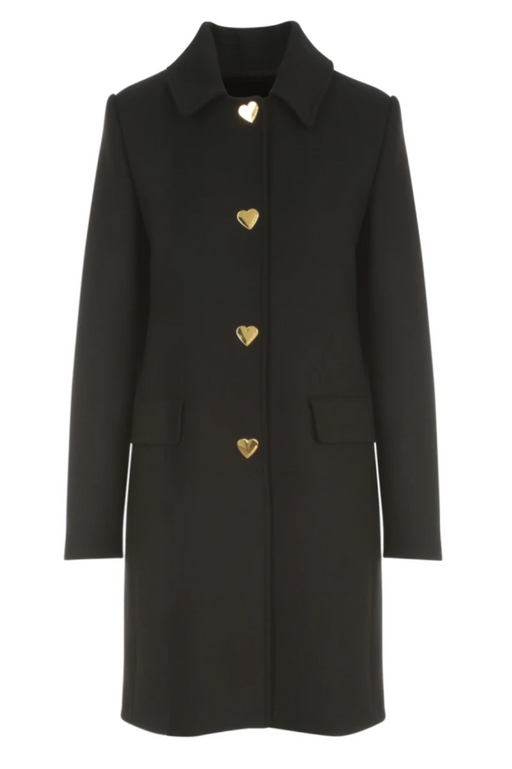 Original price $600.51Current price $494.75| /Experience the unparalleled fusion of elegance and charm with this Love Moschino wool coat. Tailored to perfection, this black beauty boasts a slee...