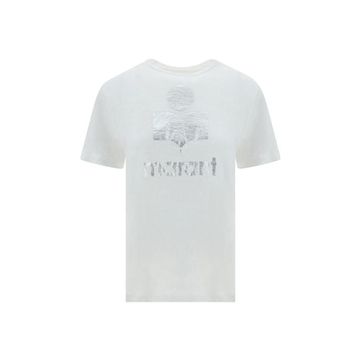 Original price $227.22Current price $207.74| /Linen Zewel T-Shirt by Marant Etoile, features ribbed crew neck, monochrome design, iconic brand monogram printed in contrast at front, regular fit.