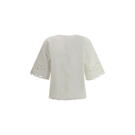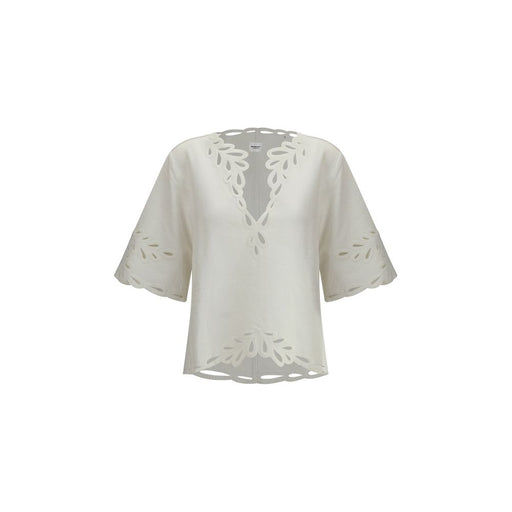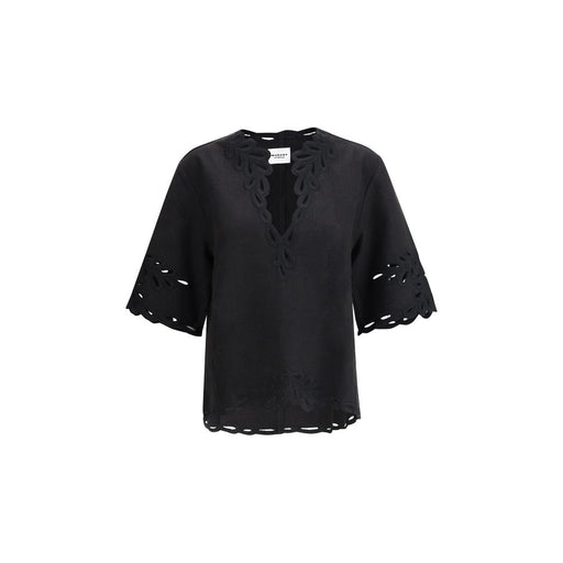 Original price $421.98Current price $370.04| /The Shana Top by Marant Étoile features a delicate V-neckline, enriched by a refined San Gallo decoration that enhances its design. The 3/4 sleeves...