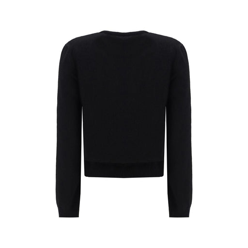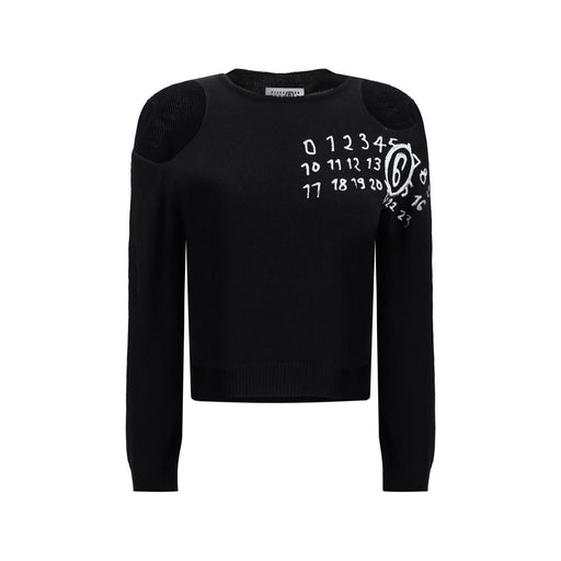 Original price $757.40Current price $558.31| /Wool Sweater by MM6, crew neck, iconic contrasting brand logo on front, cut-out detail on front panel, ribbed cuffs, ribbed hem, monochrome pattern.