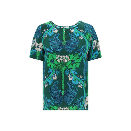 Original price $443.62Current price $346.24| /Silk T-Shirt by P.A.R.O.S.H., slits on side panels, all-over multicolored floral print, regular fit.
