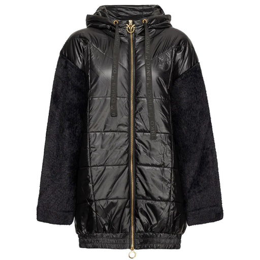 Original price $437.75Current price $264.31| /Pinko padded jacket in semi-gloss technical canvas with sleeves and back in eco fur. Hooded collar with logoed drawstring, Love Birds logo on the f...