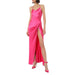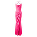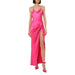 Pinko long, elegant and sleeveless dress in shiny stretch satin fabric. Fluid and feminine silhouette with thin straps that cross on the open back and are joined by a metal ring accent. Skirt with asymmetrical details and deep side slit on the front.