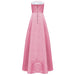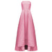 Pinko long sleeveless dress in shiny duchesse fabric with strapless neckline, high-waisted seam, full skirt with slightly high-low hem and side pockets with internal seam. Zip closure at the center back.