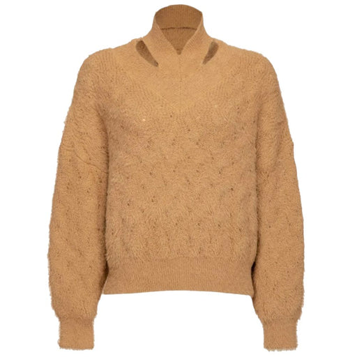 Original price $292.14Current price $235.66| /Pinko sweater in soft yarn with a teddy effect and a perforated effect. High neck with side cut-outs and a V-shaped motif. Long sleeves with low se...