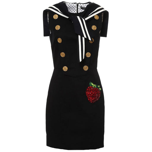 Original price $2,035.00Current price $1,175.76| /Dolce & Gabbana short sleeveless cotton sailor-themed dress with strawberry patch made from rhinestones and sequins, decorative buttons with an...