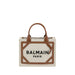 Cotton B-Army Tote Bag by Balmain features two flat top leather handles, iconic brand monogram embroidered in contrasting color on front, leather details, top hook closure, adjustable and removable leather shoulder strap, single interior compartment