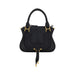 Calfskin Marcie Handbag by Chloé, double rigid leather top handle, removable and adjustable leather shoulder strap, top zipper closure, front flap with iconic leather tassel detail, iconic brand monogram press-stamped on front, open front pocket hidden by flap, single interior compartment.