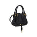 Calfskin Marcie Handbag by Chloé, double rigid leather top handle, removable and adjustable leather shoulder strap, top zipper closure, front flap with iconic leather tassel detail, iconic brand monogram press-stamped on front, open front pocket hidden by flap, single interior compartment.