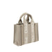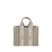 Chloé’s Woody Handbag is an elegant and practical accessory made of linen and detailed with contrasting leather. The concealed button top closure maintains a clean design, while the double flat handles and extension on the leather side panels add sophistication. The removable and adjustable leather shoulder strap also allows it to be carried on the shoulder, offering versatility. Inside, a welt pocket keeps smaller items tidy, while the brand’s iconic signature is affixed to the side panels, lending a distinctive touch.