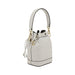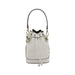 Calfskin Mon Tresor Bucket Bag by Fendi, flat leather handle removable via logo hooks, iconic all-over embossed brand FF logo, top closure via adjustable leather drawstring, flat base of the bag, gold-plated iconic brand signature plaque applied to the front.