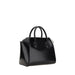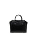 Calfskin Antigona Handbag by Givenchy, shiny leather design, geometric pattern, two rigid top handles, top closure by zipper with double slider, contrasting iconic brand monogram on front, adjustable and removable shoulder strap, attached support feet at base of bag.