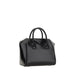 Calfskin Antigona Handbag by Givenchy, shiny leather design, geometric pattern, two rigid top handles, top closure by zipper with double slider, contrasting iconic brand monogram on front, adjustable and removable shoulder strap, attached support feet at base of bag.