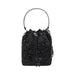 Bucket Bag by Prada, flat circular top handle, drawstring closure at top, sequin and jewel applique details on front, single interior compartment, adjustable and removable leather shoulder strap.