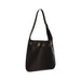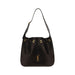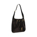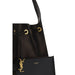 Calfskin Paris Shoulder Bag by Saint Laurent features drawstring top closure, adjustable flat leather shoulder strap, iconic brand logo plaque applied to front and gold-plated, contrasting gold-plated drawstring loops, interior pouch with zipper closure and with iconic brand monogram stamped on front.