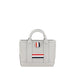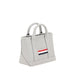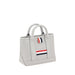 Thom Browne’s Leather Handbag features two tubular top handles for a comfortable grip, along with an adjustable and removable flat shoulder strap for a versatile carrying option. It is embellished with the brand’s iconic signature bands on the front and back. Inside, the bag has a single internal compartment, offering a simple yet functional design.