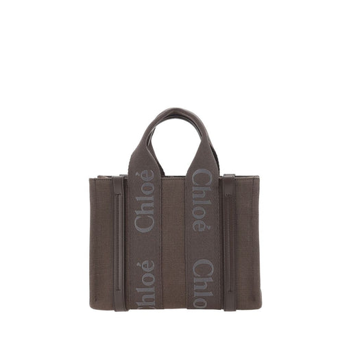 Woody Linen Handbag by Chloé, top closure by concealed button, double flat handles with extension on contrasting leather side panels, removable and...