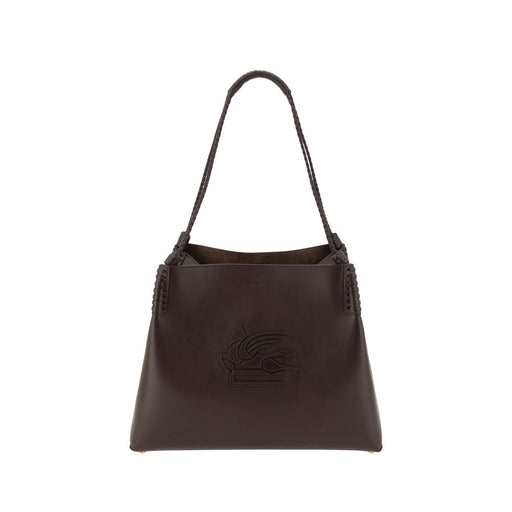Leather Libra Shoulder Bag by Etro, two top braided handles, hook-and-eye closure at top, iconic Pegasus pattern patch applied on front panel, meta...
