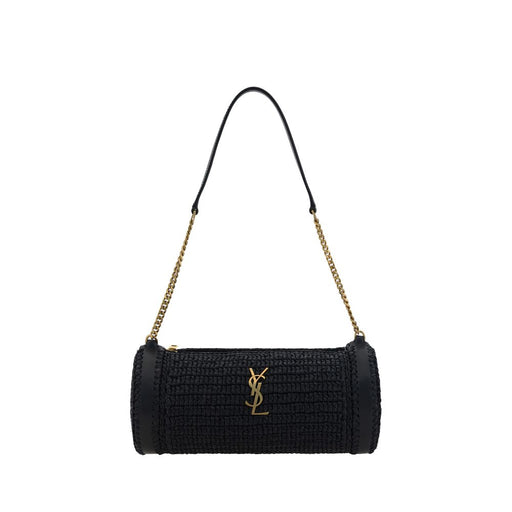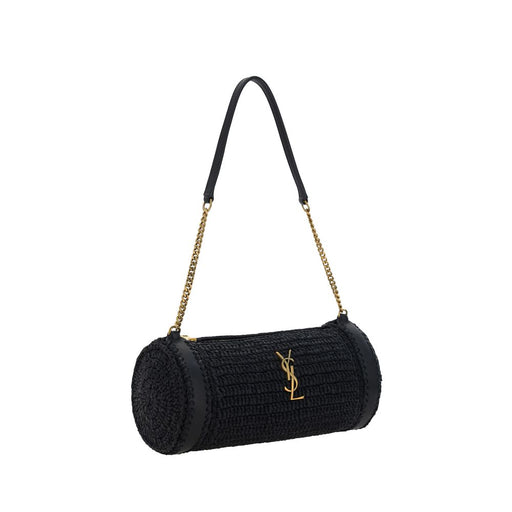 Raffia Shoulder Bag by Saint Laurent, cylindrical design, a top zipper closure, a chain and leather handle, a single compartment, and a plaque with...
