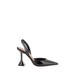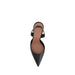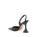 Leather Holli Pumps by Amina Muaddi, elongated almond toe on front, geometric leather heel, slingback detail on heel, patent leather design, press-on logo leather insole.