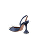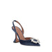 Leather Velvet Begum Pumps by Amina Muaddi, denim-printed velvet design, almond toe on front, geometric leather heel, elasticized slingabck detail at heel, rhinestone and glitter jewel applied embossed on toe, logo-embossed insole.