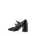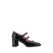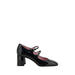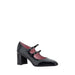Calfskin Alice Pumps by Carel Paris, patent leather design, almond toe on front, multiple and adjustable straps on back of foot, leather chunky heel, logo insole.