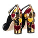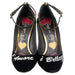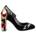 Dolce & Gabbana décolleté in velvet and gold patent calfskin, velvet heart-shaped embroidery and silver writing on the front, snakeskin strap. Heel: 9 cm