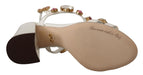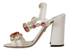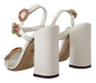Step into luxury with these exquisite Keira ankle strap heels by Dolce & Gabbana. Crafted with elegance in Italy, these sandals are a true testament to high fashion and comfort. Adorned with a charming rose print and sparkling crystals, these white leather sandals are designed to turn heads and elevate any ensemble.