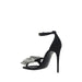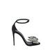 Sandals by Dolce & Gabbana, satin design, open round toe on front, rhinestone bow detail on upper, logo leather insole, stiletto heel, ankle lap strap closure with adjustable buckle.
