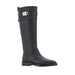 Calfskin Boots by Ferragamo, knee-high knuckle, tonal stitching and topstitching, contrasting plaque with iconic brand logo on outer side panel., almond toe, block heel.