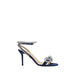 Double Bow Sandals by Mach&Mach, silk satin upper, leather stiletto heel, open toe on front, rhinestone-embellished strap design around ankle with buckle for closure, iconic rhinestone-covered sculptural bow embossed on front.