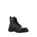 Leather Ankle Boots by Prada, lace-up front closure, paneled design with tone-on-tone stitching, pull-on for easy on-and-off fit, non-slip rubber lug sole, block heel, iconic triangular embossed applique plaque on ankle, round toe, shiny leather design.