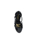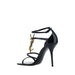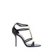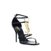 Calfskin Cassandra Sandals by Saint Laurent, featuring an open front round toe, an adjustable ankle strap, an embossed iconic YSL brand logo on the front, a leather stiletto heel, and a cage style.