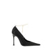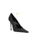 Saint Laurent’s silk Pumps feature an elongated toe and flared stiletto heel, enhancing the model’s elegance. The Cassandre charm chain anklet adds a distinctive touch, while the contrasting logoed insole completes the design with sophistication.