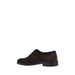 Calfskin Loafers by Santoni, suede-effect leather design, almond toe on front, slight leather block heel, front tray embellished with metal buckles, logo-embossed insole.