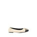 Leather Claire Ballerinas by Tory Burch, two-tone design with contrasting round toe, three-dimensional plaque with iconic brand logo applique on front, elasticated heel.