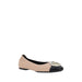 Calfskin Claire Ballerinas by Tory Burch, two-tone design with contrasting round toe, three-dimensional plaque with iconic brand logo applique on front, heel and elasticated.