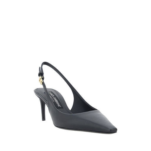 Original price $897.60Current price $689.86| /Calfskin Slingback Pumps by Dolce&Gabbana, smooth leather design, iconic D&G plaque on adjustable slingback strap, leather stiletto heel.