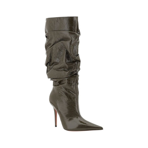 Original price $1,752.84Current price $972.72| /Lambskin Anok Boots by Amina Muaddi featuring a grained leather design, an elongated toe, a leather stiletto heel, and a ruffled-effect shaft.