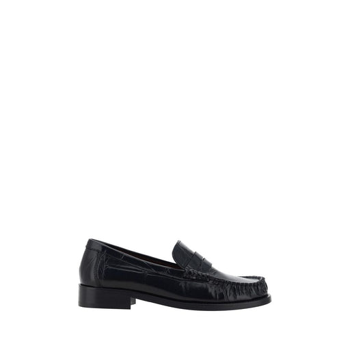Original price $648.74Current price $463.72| /Calfskin Dylan Loafers by Paris Texas, slightly elongated round toe, leather block heel, front tray made of leather, logo-embossed insole.